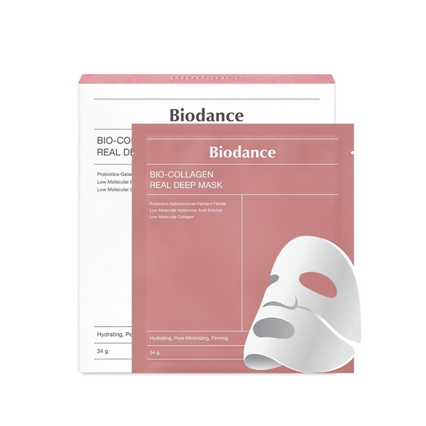 Biodance Bio-Collagen Deep Mask deeply hydrates, tightens pores, firms skin, strengthens barrier with probiotics, and is hypoallergenic.