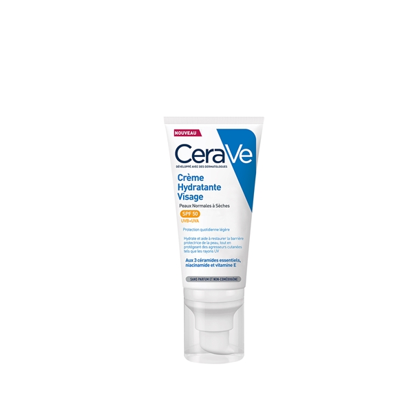 La Crème Hydratante Visage SPF50 de CeraVe est un soin qui hydrate les peaux normales à sèches. Cette crème à la texture légère non collante s’applique sur le visage et le cou pour une peau hydratée toute la journée. Sa protection UV SPF50 bloque les rayons UVA et UVB afin de protéger la peau du soleil.