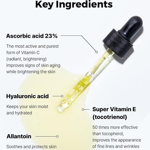 The 23% highly concentrated stabilized pure vitamin C serum improves skin tone, reduces wrinkles, and targets dull and rough skin as a vitamin C booster. This serum is highly effective, and to slowly prevent oxidation, it is divided into two layers with oil on top of the serum, providing a moisturizing finish.