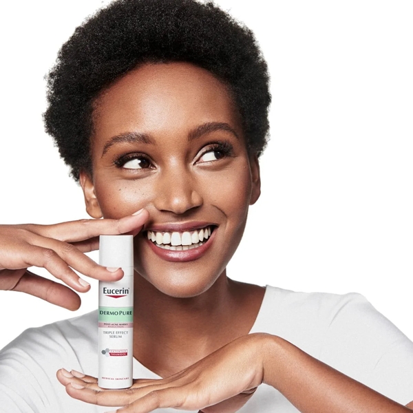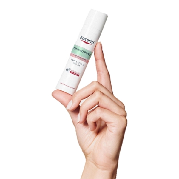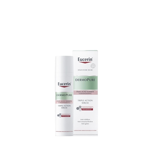 Met Eucerin DermoPure Triple Action Serum met gepatenteerd Thiamidol kunt u eindelijk onzuiverheden en post-acne vlekken tegengaan met 3 belangrijke factoren: 1 Anti-vlekken: gepatenteerd Thiamidol werkt op de belangrijkste oorzaak van hyperpigmentatie door hardnekkige vlekken na acne te verminderen en de terugkeer ervan te voorkomen. 2 Anti-onzuiverheden: Salicylzuur vermindert onzuiverheden effectief en Licochalcone A helpt terugkeer ervan te voorkomen. 3 Anti-glans: de Regulerende Sebum Technologie zorgt voor een langdurige matte en droge finish. Het Triple Action Serum heeft een verbeterde doeltreffendheid wanneer het samen met de Eucerin DermoPure Beschermende Fluid SPF 30 wordt gebruikt.